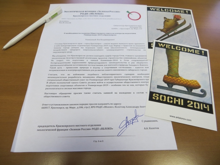 Сегодня председатель Красноярского отделения фракции «Зеленая Россия» партии «ЯБЛОКО Александр Колотов передал в приемную губернатора края Льва Кузнецова обращение о необходимости организации общественного экологического контроля за подготовкой международной студенческой Универсиады-2019 в Красноярске.