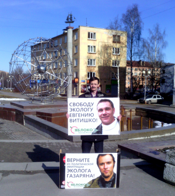 Член Бюро партии «ЯБЛОКО», член Фракции «Зелёная Россия» Дмитрий Рыбаков продолжил серию прошедших по России одиночных пикетов в поддержку экологов Евгения Витишко и Сурена Газаряна. Пикет состоялся 25 марта на Студенческом бульваре в Петрозаводске.