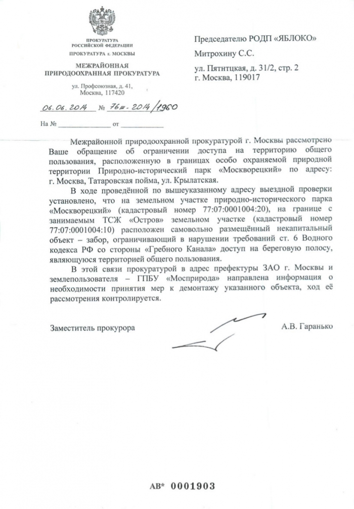 После инспекции Сергей Митрохин обратился в природоохранную прокуратуру с требованием принять необходимые меры по устранению нарушений. Прокуратура провела проверку и подтвердила, что объект на территории находится незаконно. «В этой связи в адрес префектуры ЗАО г. Москвы и землепользования – ГПБУ «Мосприрода» направлена информация о необходимости принятия мер к демонтажу указанного объекта, ход ее рассмотрения контролируется», – говорится в ответном письме прокуратуры.