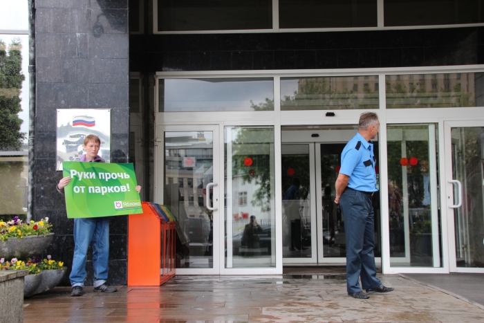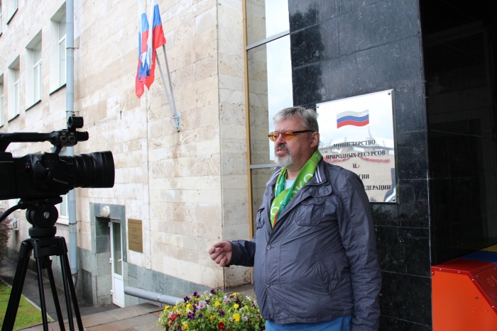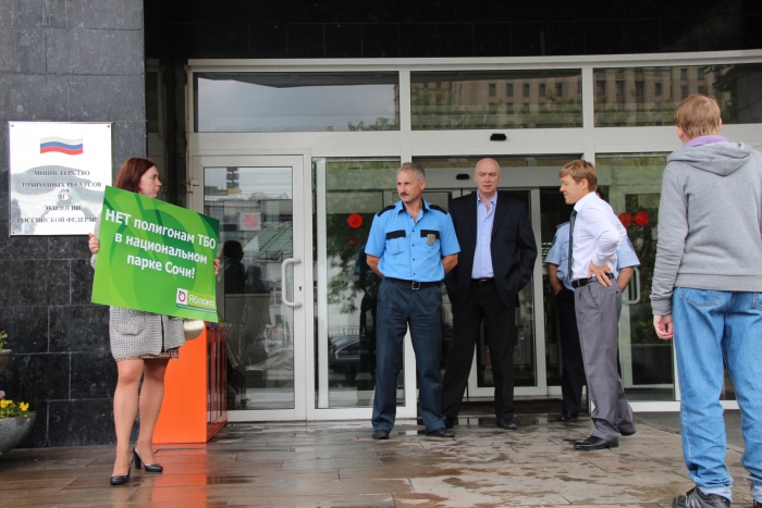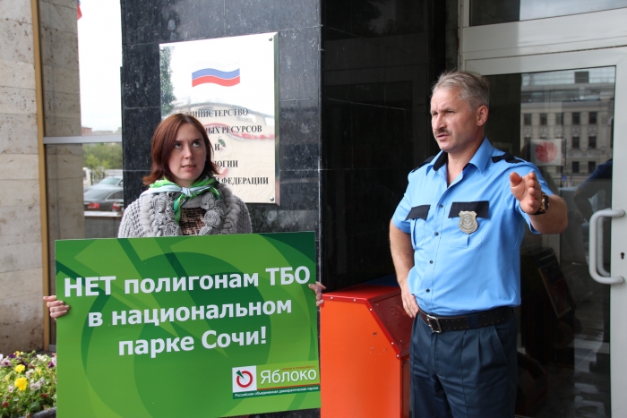 Акция протеста «ЯБЛОКА» стартовала в 11 часов у центрального входа в Минприроды на Большой Грузинской. Несколько активистов вместе со старшим научным сотрудником Института водных проблем РАН, членом партии «ЯБЛОКО» Юрием Медоваром поочередно стояли у входа в министерство с плакатами: «Нет полигонам ТБО в национальном парке Сочи» и «Руки прочь от парков».