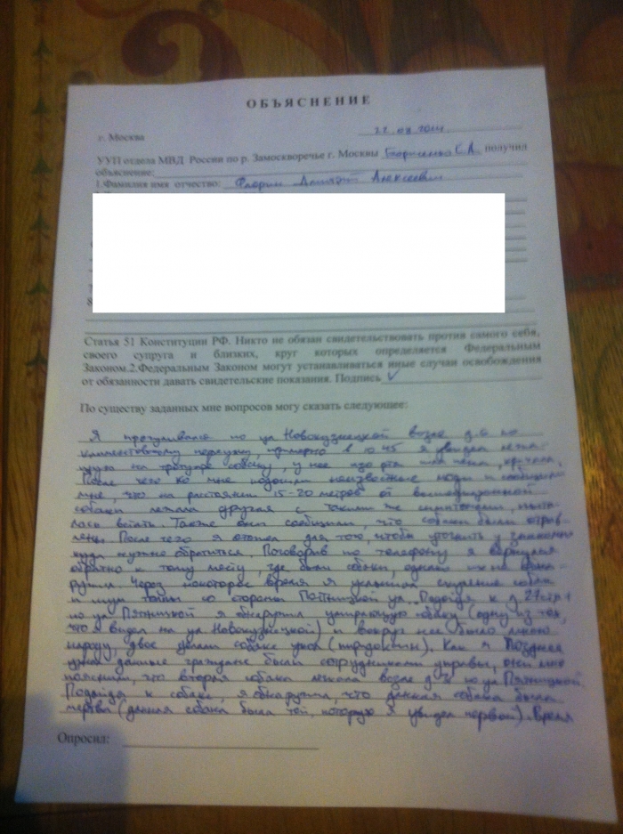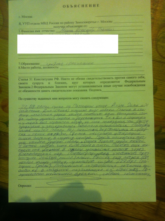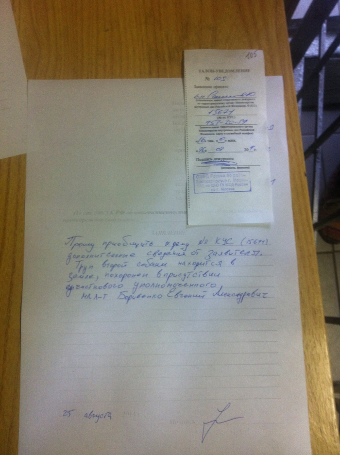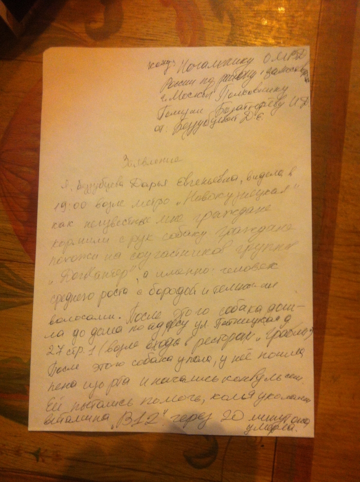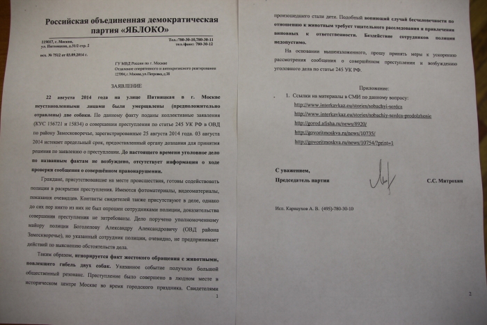 Заявление с требованием принять все меры к расследованию общественно-опасного деяния – отравлению собак, а также с требованием разобраться с действиями сотрудников полиции ОВД Замоскворечье, чьи действия, по мнению гражданских активистов, попадают под определение «бездействие», направлено сегодня в ГУВД Москвы на официальном бланке партии «ЯБЛОКО» за подписью лидера партии Сергея Митрохина.