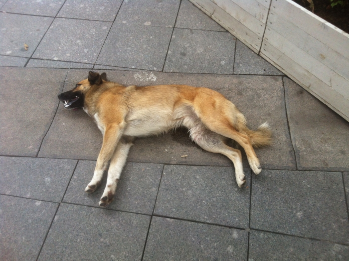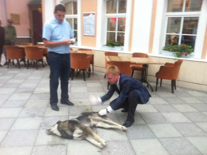 Активист «ЯБЛОКА» Дмитрий Флорин около 20 часов вечера шел по направлению к метро Новокузнецкая по Новокузнецкой улице (параллельной с Пятницкой) и увидел, как у входа в гастротеку «Простые вещи» на тротуаре лежала крупная рыжая собака, бившаяся в агонии. В 15-20 метрах дальше к метро похожее происходило с другой, черной собакой, которая еще пыталась вставать.