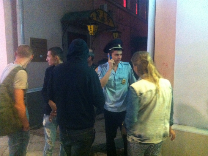 Возле здания по Пятницкой 27, строение 1, у входа в ресторан «Грабли» лежала черная собака, которая ранее находилась на Новокузнецкой, бившаяся в агонии. Несмотря на то, что собаке была сделана инъекция необходимого лекарства, она умерла спустя 15 минут. Вокруг происходящего собралось около 100 граждан, гуляющих на празднике, у некоторых женщин и детей случилась истерика. Флорин вызвал на место сотрудников полиции. Служащие коммунальных служб, по команде представителей управы Замоскворчеье несколько раз пытались забрать труп собаки, но граждане не дали им этого сделать до приезда полиции. Однако труп второй (рыжей) собаки, скончавшейся прямо под окнами здания «ЯБЛОКА», коммунальщики увезли в неизвестном направлении еще до приезда полиции.