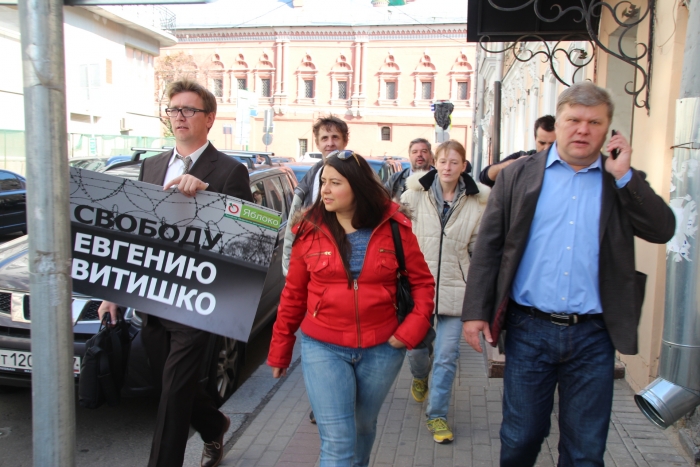 Порядка 15 человек вышли на Неглинную улицу с флагами «ЯБЛОКА» и плакатами с требованием освободить Евгения Витишко.