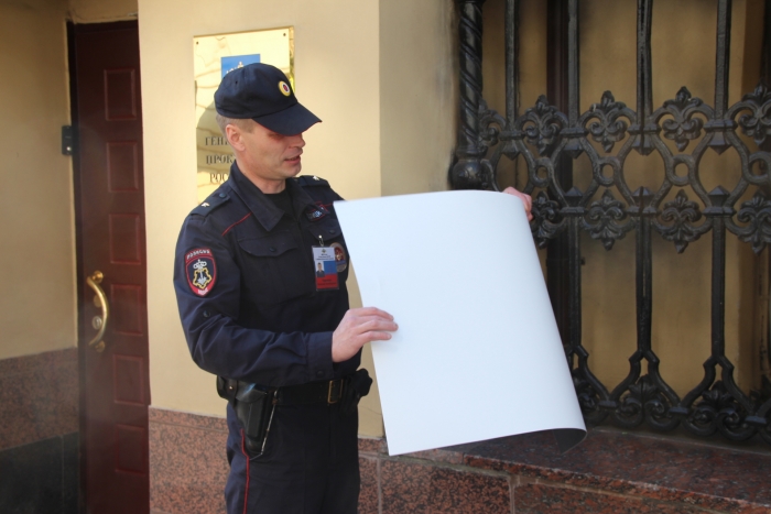Через некоторое время появился молодой человек в гражданском и также потребовал убрать плакат с забора Генпрокуратуры. Не добившись своего, он скрылся в недрах ведомства. И лишь спустя 6 минут с момента «дарения» плаката, появился сотрудник полиции, который снял плакат с забора, свернул его и унес в здание Генпрокуратуры.
