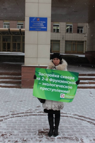 Сегодня активист партии «ЯБЛОКО» Майя Завьялова провела очередной пикет у префектуры ЦАО против признания публичных слушаний по строительству на территории сквера Московской государственной академии хореографии по адресу: 2-я Фрунзенская ул., вл.5 стр.1.