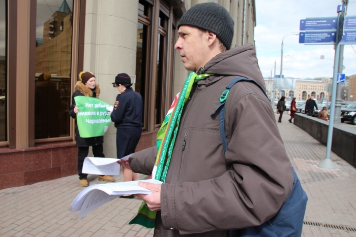 За полчаса до передачи подписей активисты «ЯБЛОКА» провели пикет у Администрации президента против добычи никеля в Воронежской области. Накануне в офисе партии «ЯБЛОКО» прошел круглый стол, на котором экологи обсудили опасности сырьевого развития Центрального Черноземья.