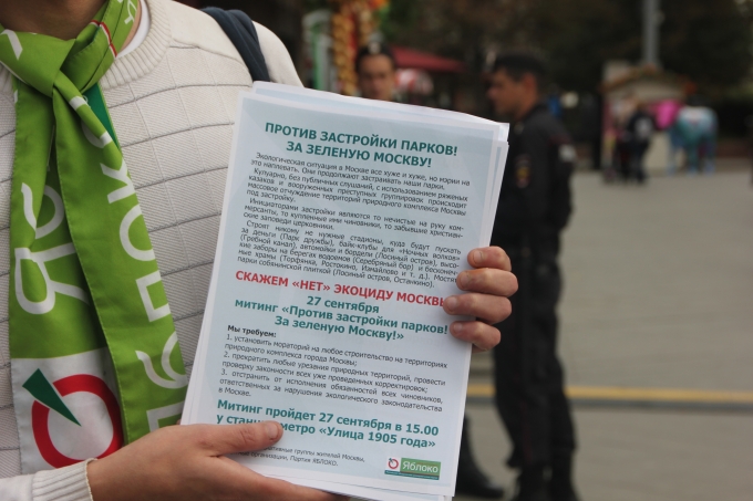 Пикет прошел без эксцессов. Активисты партии ЯБЛОКО раздавали листовки с приглашением принять участие в общегородском митинге против застройки парков Москвы 27 сентября.