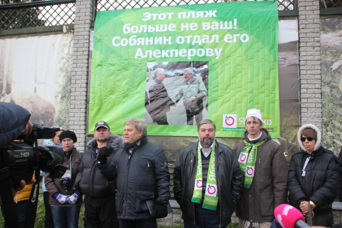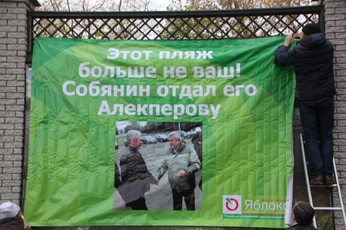 Активисты ЯБЛОКА повесили на забор участка баннер с надписью «Этот пляж больше не ваш. Собянин отдал его Алекперову».