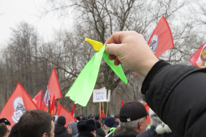 Днем жители пришли в парк и расположились вокруг территории, на которой проходил митинг сторонников строительства. Символом протеста стали зеленые ленты и свистки, которыми граждане регулярно выражали протест против превращения ныне общедоступного парка в огороженную стройплощадку, а затем и в огороженное храмовое подворье.