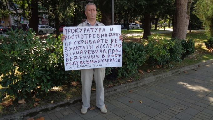 Одиночный пикет провел лидер Северо-Осетинского отделения фракции «Зеленая Россия» партии «Яблоко», активист «Экологической вахты по Северному Кавказу» Ацамаз Хадиков. Пикет прошел 7 октября в сквере на улице Конституции напротив городской поликлиники №1. Акция привлекала внимание многих пациентов, которые шли в поликлинику и из поликлиники.
