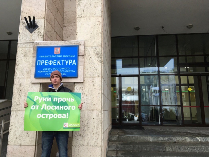 Активисты Московского «Яблока» сегодня провели пикет у здания комиссии. Они держали плакат «Руки прочь от “Лосиного острова!”».