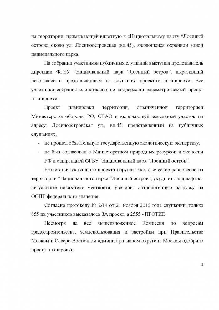 Председатель Московского «ЯБЛОКА» Сергей Митрохин обратился к Министру природных ресурсов и экологии Российской Федерации Сергею Донскому, с требованием вмешаться в процесс реализации московскими властями Проекта планировки территории, ограниченной территорией Министерства обороны РФ, СВАО и включающей земельный участок по адресу: Лосиноостровская ул., вл.45, и не допустить нанесение непоправимого ущерба в связи с уничтожением уникальной экологической территории «Национального парка “Лосиный остров”».