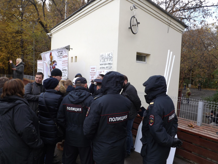 Уже через полчаса ко мне как к организатору подошла группа полицейских и офицер потребовала убрать плакаты, надписи на которых гласили об убийстве населения заводами «Ростех».
